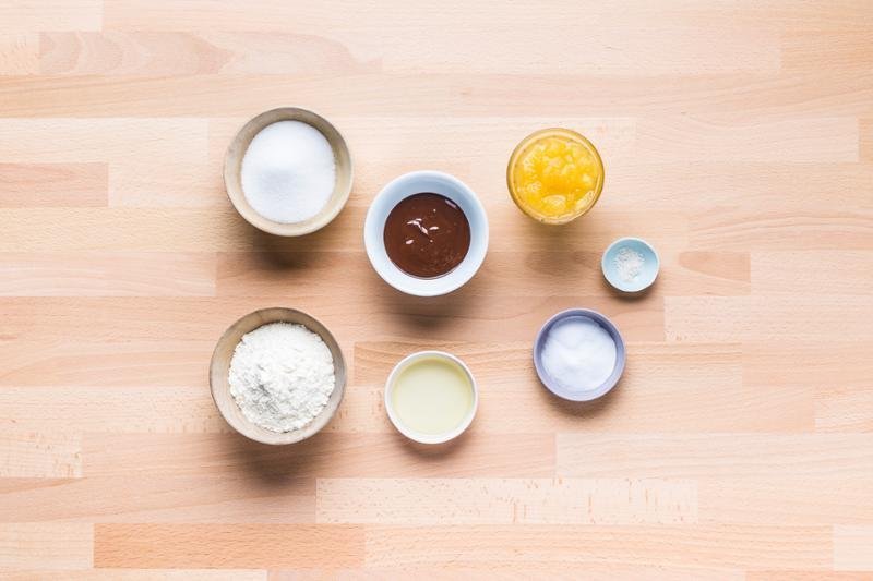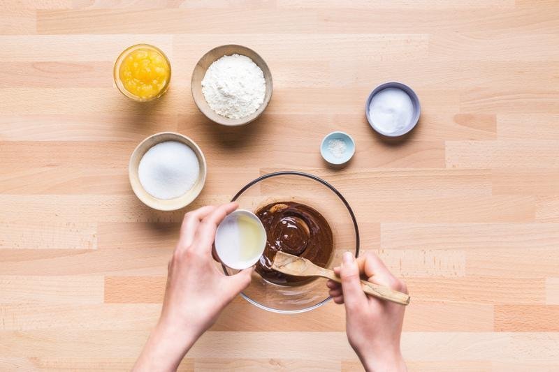 Keverje össze az olvasztott csokoládét az olajjal. Adja hozzá a kompótot, majd a cukrot és a sót. Végül keverje bele a liszt és a szódabikarbóna keverékét.