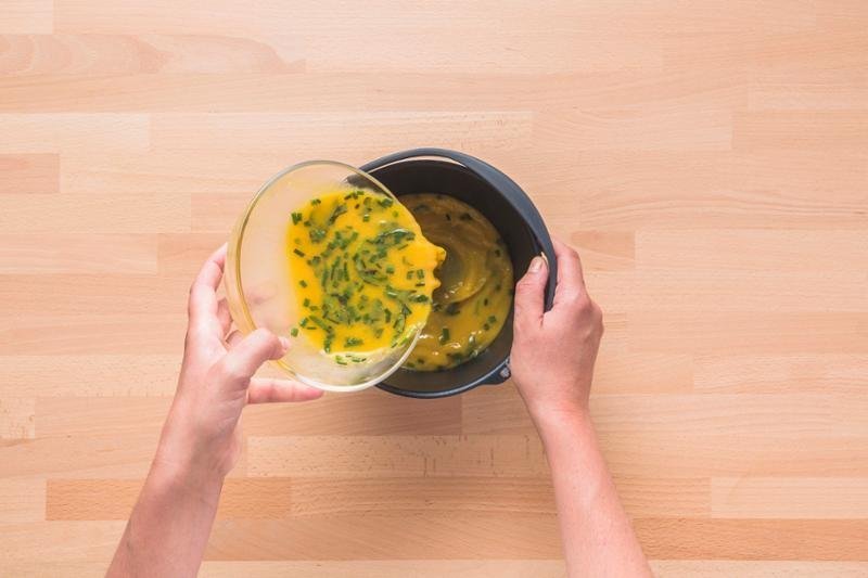 A tojásokat verje fel 2 evőkanál olajjal, a fűszernövényekkel, sóval és borssal. Öntse a keveréket a formába.