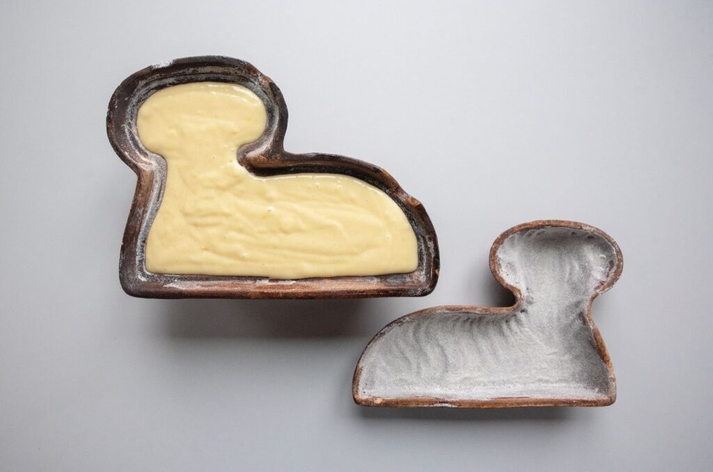 7. LÉPÉS: Kenje ki a bárány sütőformát olajjal, és szórja be rétesliszttel. Ezután öntse bele az előkészített tésztát.