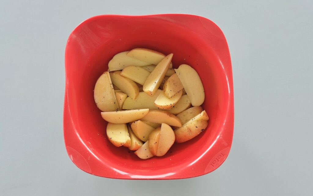 1. LÉPÉS: A megmosott burgonyát vágja holdacskákra, sóval, borssal és egy csepp olajjal ízesítse, majd keverje össze.