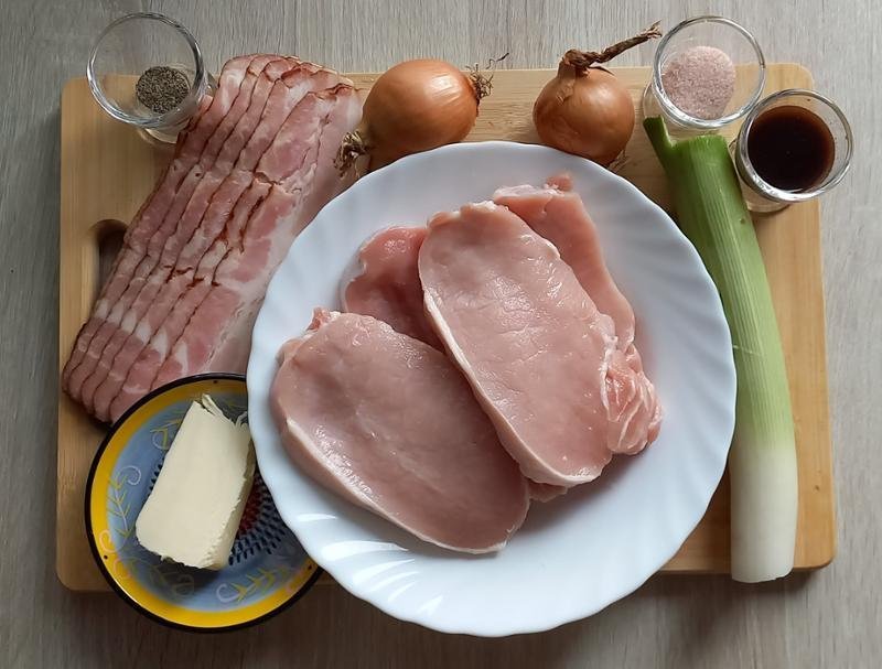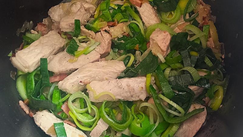 1. LÉPÉS: Készítse elő a hozzávalókat. A hagymát vágja apróra. A húst vágja nagyobb kockákra. A póréhagymát karikázza fel.