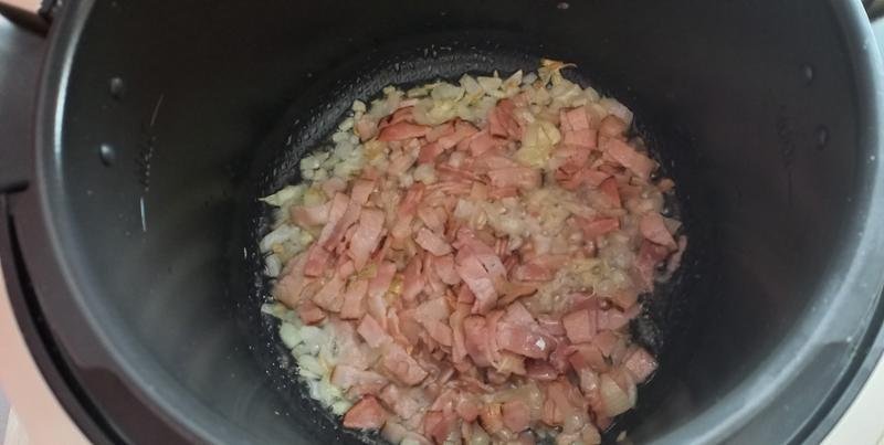 3. LÉPÉS: Nyomja meg a START gombot. Adja hozzá a szalonnát a hagymához, és pirítsa meg. A programból való kilépéshez nyomja meg a STOP gombot.