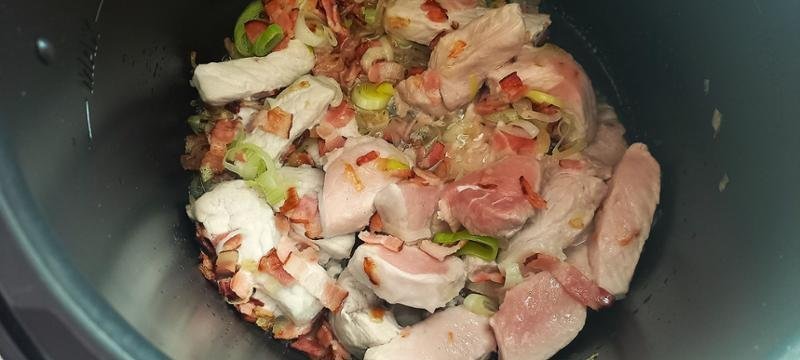 5. LÉPÉS: Nyomja meg a START gombot. Adja hozzá a póréhagymát és a worchester szószt, fedje le vízzel, hogy a víz félig ellepje a húst, és kapcsolja be a kuktát. A programból való kilépéshez nyomja meg a STOP gombot.