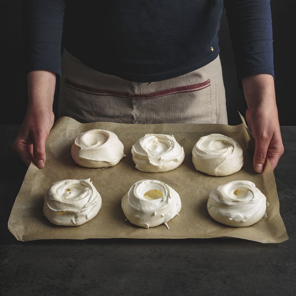 Készítsünk mini Pavlova tortákat, és tálaljuk őket külön tányérokon.