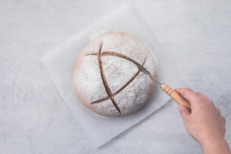 Nedvesítse be újra a kenyér felületét egy ecsettel. Készítsen bevágásokat késsel. Süsse a kenyeret 25 percig 240 fokon.