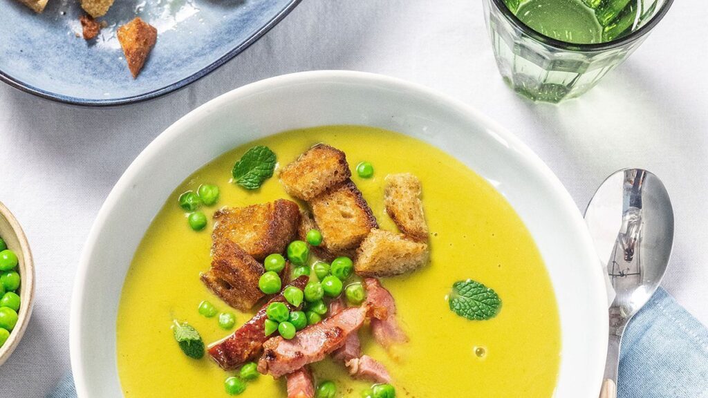 Zöldborsókrémleves sonkával és krutonnal főtt.