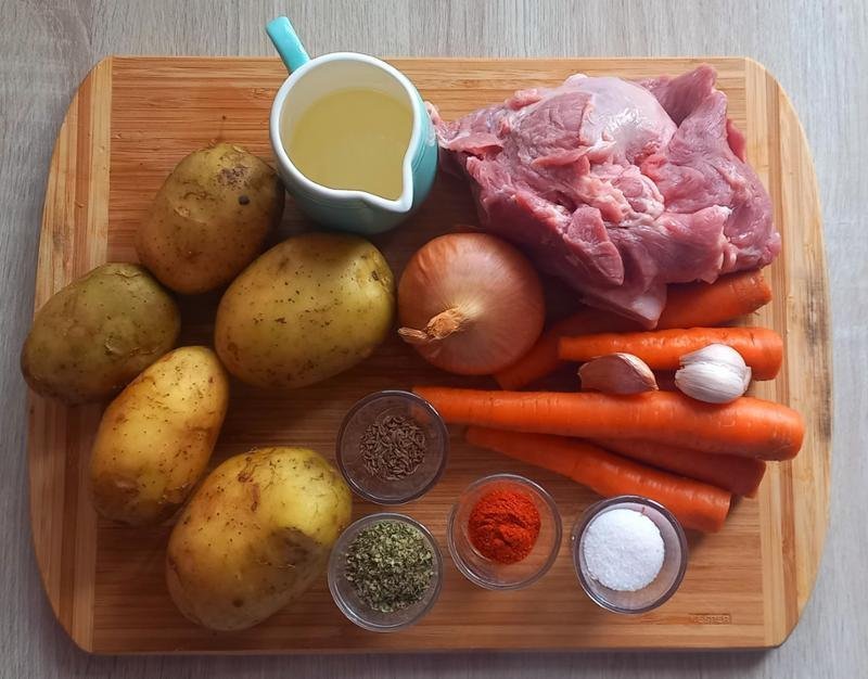 2. LÉPÉS: Kockázza fel a húst, kaparja le a burgonya héját és vágja nagyobb kockákra, a sárgarépát szintén kaparja le és vágja nagyobb darabokra. Hámozza meg a hagymát, és vágja kockákra.