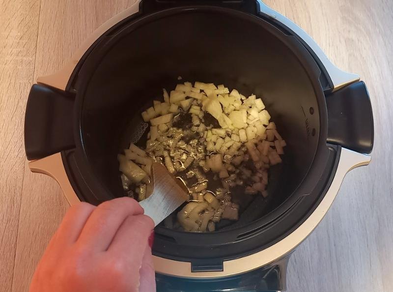 3. LÉPÉS: Öntse az olajat a lábasba, és adja hozzá a kockára vágott hagymát. Válassza az Intenzív sütés programot, és nyomja meg a START gombot. Süsse 3 percig.
