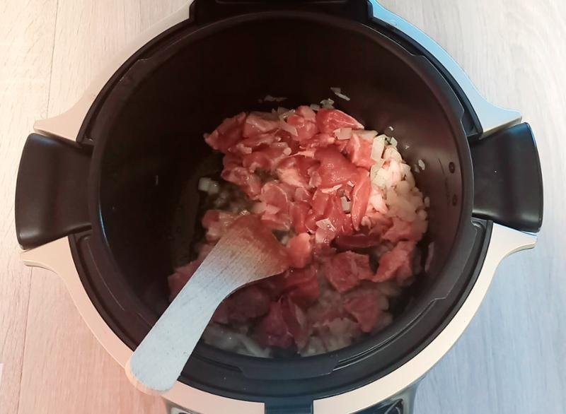 5. LÉPÉS: Amikor a hús minden oldalról megbarnult, öntsön rá 500 ml vizet, állítsa be az Expressz főzés nyomás alatt programot, és nyomja meg a START gombot.