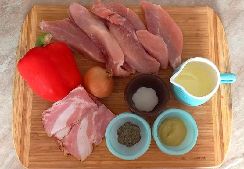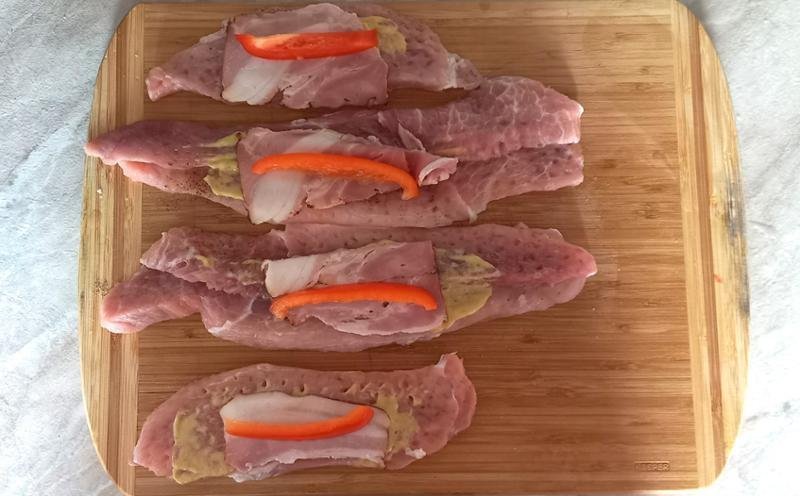 2. LÉPÉS: A húst klopfolóval puhítsa meg, sóval és borssal fűszerezze, és mustárral dörzsölje be. Helyezzen minden szeletre egy szelet szalonnát és egy csík paprikát. Csomagolja be és fogpiszkálóval rözgítse.