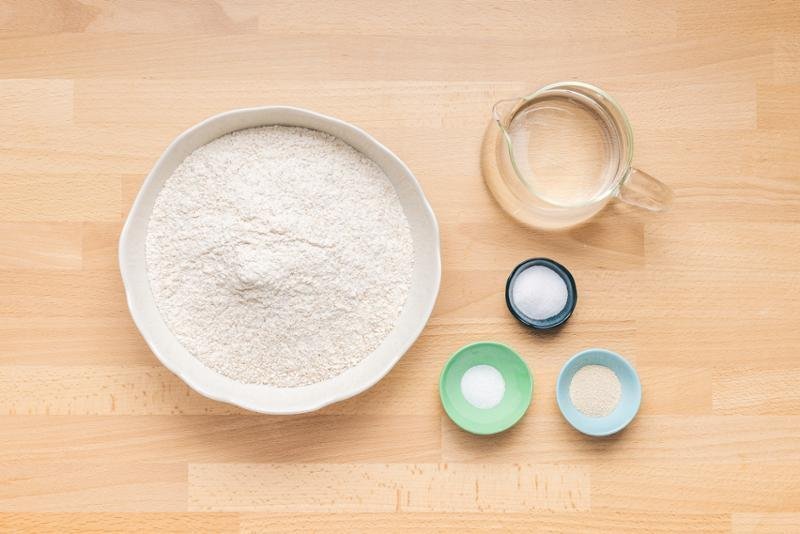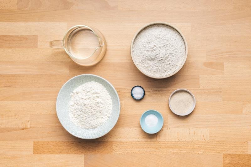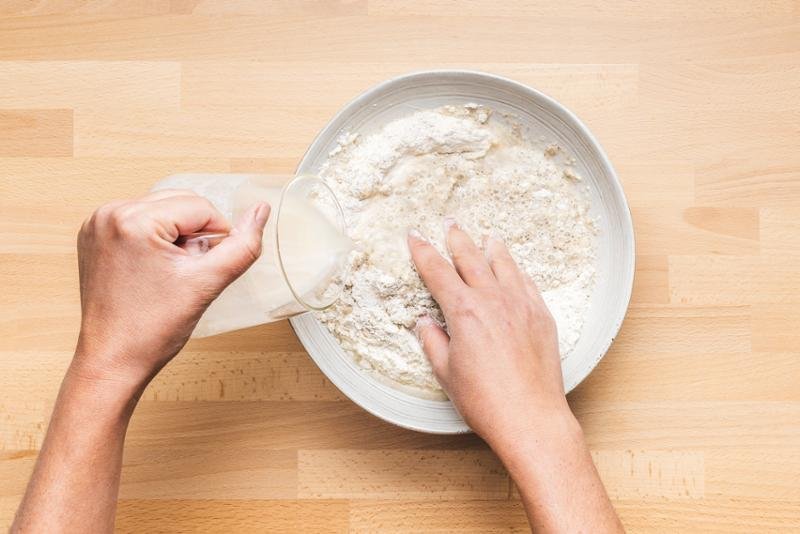 3. LÉPÉS: Öntse a lisztet, a víz-élesztő keveréket és a sót egy tálba. Gyúrja kézzel 3 percig.