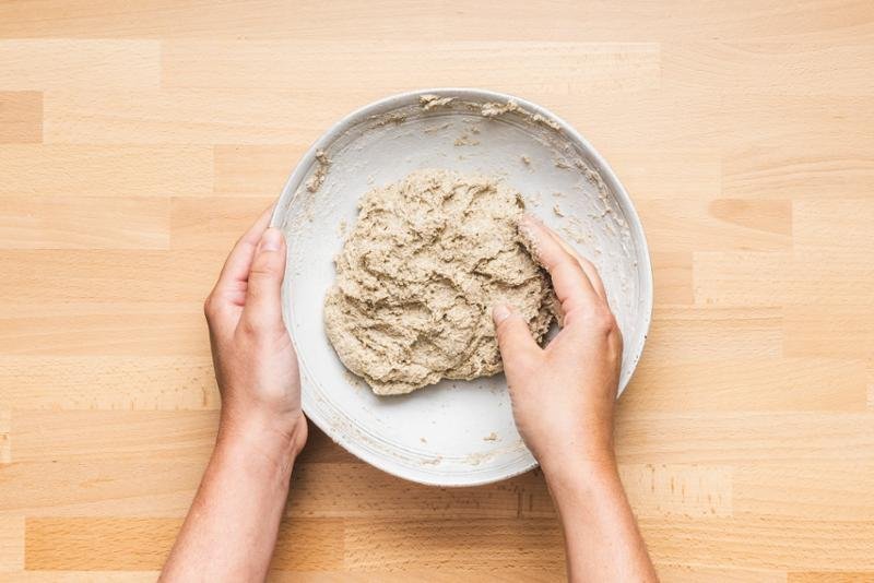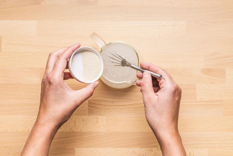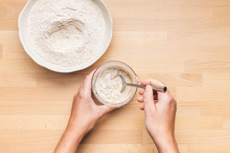 2. LÉPÉS: Az indítókovászhoz: futtassa fel az élesztő felét 60 g vízben. Keverje össze 60 g sima fehér liszttel. Fedje le fóliával, és pihentesse 2 órán át.