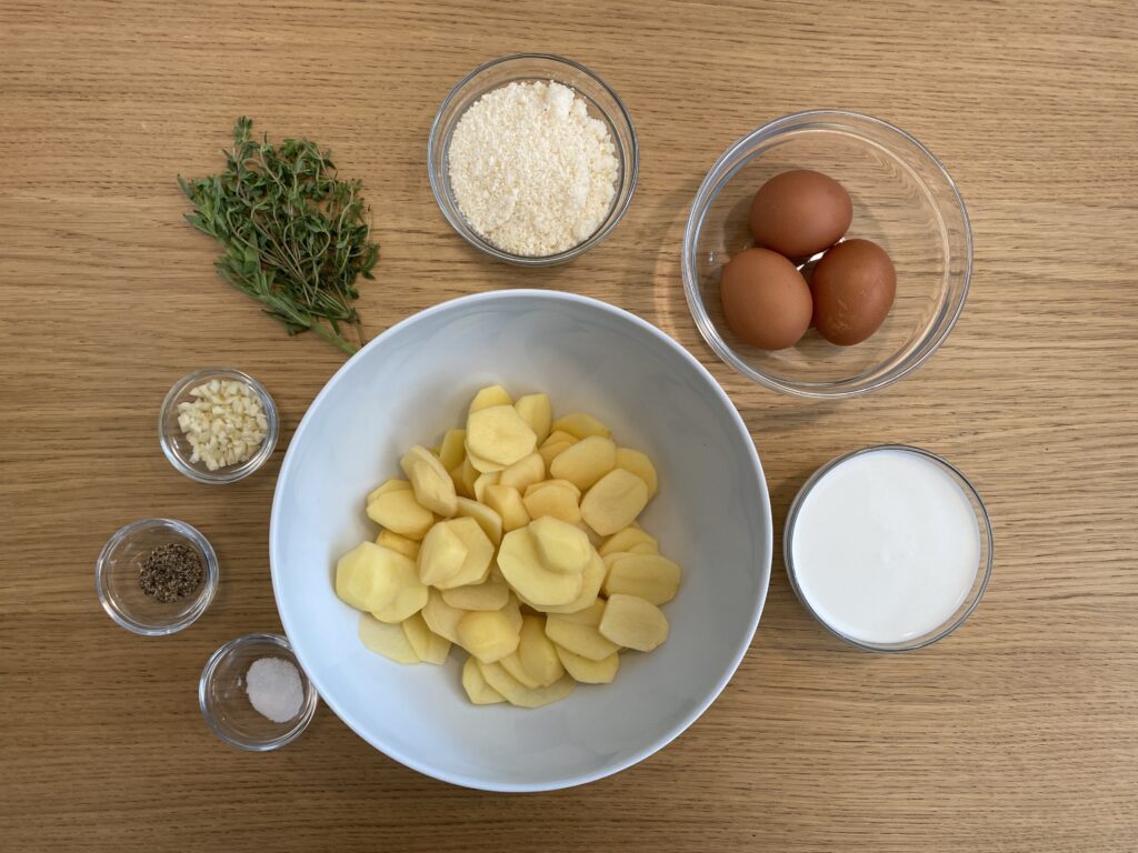 2. LÉPÉS: A karikákra vágott krumplit tegye tálba és adja hozzá a tejszínt, parmezánt, tojást, fokhagymát, sót, borsot és fűszereket.