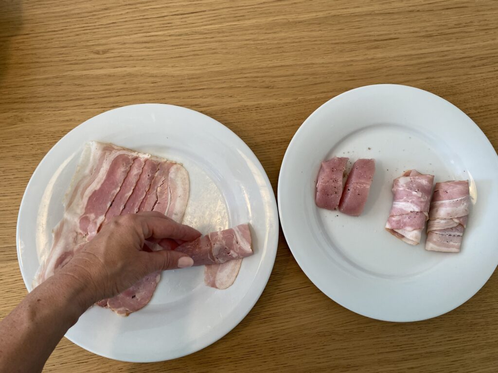 4. LÉPÉS: A pulykamellet vágja kisebb darabokra, ízesítse sóval és borssal, tekerje a szalonnába.