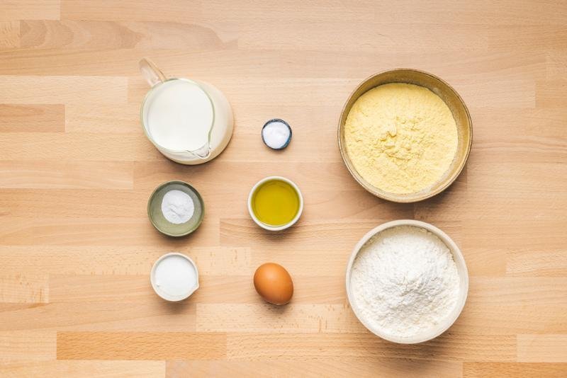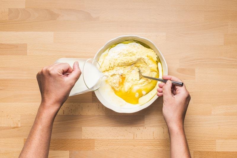 2. LÉPÉS: Keverje össze a kukoricalisztet, a lisztet, a cukrot, az élesztőt és a szódabikarbónát egy tálban. Adja hozzá a tojást, a tejet és az olajat. Keverje össze.