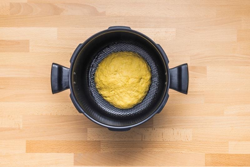 6. LÉPÉS: Vajazzon ki egy 28 cm-es serpenyőt, és öntse bele a tésztát. Tegye a süteményt a sütőbe, és vegye le az Ingenio fogantyút. Süsse 20 percig. Ellenőrizze egy kés hegyével. Száraznak kell lennie.