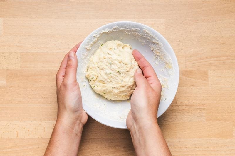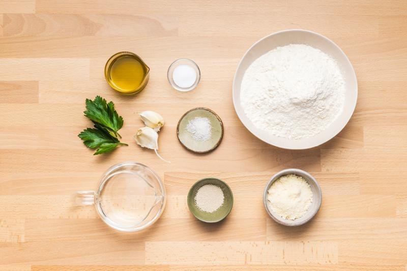 3. LÉPÉS: Öntse a lisztet, a víz-élesztő keveréket, 20 g olajat, a fokhagymagerezdeket, a petrezselymet és a sót egy tálba. Dagassza 3 percig.