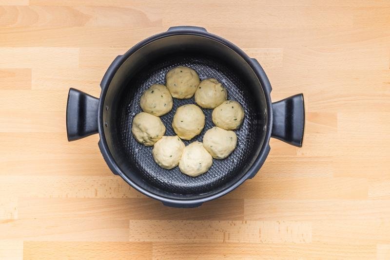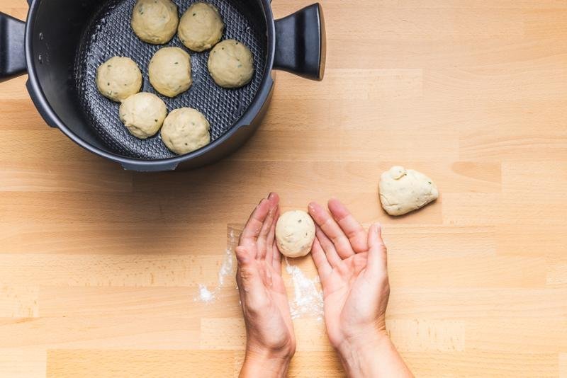 5. LÉPÉS: Hajtogassa át 8-szor. Készítsen kis, egyenként 45 g-os golyókat. Tegye egy olajozott tálba. Hagyja kelni 1 órán át.