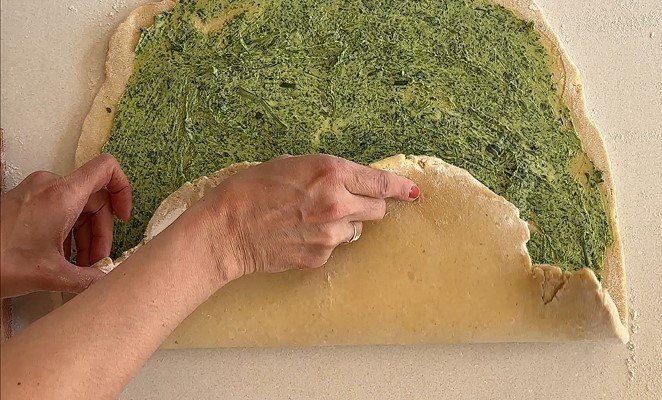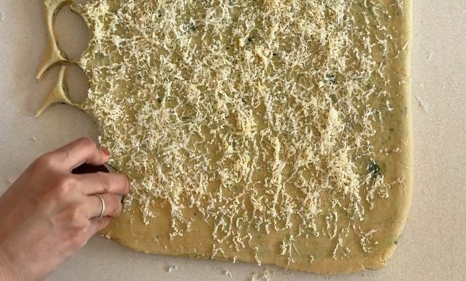 2. LÉPÉS: Lisztezett felületen vékonyra nyújtjuk a tésztát, majd az egyik felét megkenjük a puha vajjal elkever pesztóval, félbehajtjuk. Újra megkenjük az egyik felét, és újra félbehajtjuk. Ismét kinyújtjuk, kb. ujjnyi vastagságúra.
