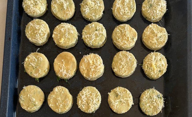 3. LÉPÉS: Kiszaggatjuk, sütőpapírral bélelt tepsire teszszük, a pogácsák tetejét megkenjük tojással, majd megszórjuk reszelt sajttal.