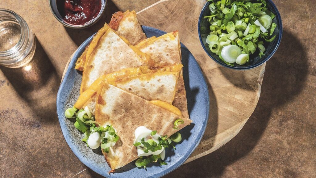 A tortillát 4 darabra vágjuk, és a tejszínnel, hagymával és korianderrel tálaljuk. A fenti folyamatot az összes tortillával megismételjük.