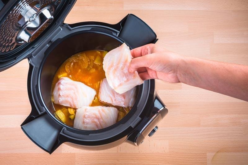 KROK 6: Obalenou rybu vložte do košíku a nastavte program ryba. Brambory vložte do druhého košíku, zvolte program hranolky a upravte čas přibližně na 10 minut.